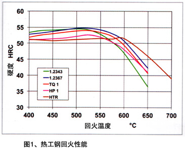 圖表不僅是壓鑄模具熱處理時一個重要的工作方法,而且也對熱工鋼正確選擇有幫助。這樣的圖表明的是由于加熱鋼的硬度變化。圖1,是所介紹鋼的回火曲線,在此曲線圖上,德國使用較少的1.2344鋼未列上去。除了HTR鋼,所列鋼種在500——550度之間回火溫度下表現(xiàn)有顯明的二次硬度最大值。隨著回火溫度繼續(xù)增加,硬度下降。由曲線下降坡度可以推斷回火穩(wěn)定性。回火曲線下降越陡,鋼的回火穩(wěn)定性越小,在澆注作業(yè)中鋼的加熱反應越敏感。與1.2343鋼相比,此曲線證明1.2367鋼有較好的回火穩(wěn)定性,在550度之上回火溫度技術范圍,TQ1和HP1達到幾乎與1.2367一樣的回火穩(wěn)定性。特種鋼HTR由于其高的鎢含量表現(xiàn)出較其余鋼明顯高的回火溫度。二次硬度最大值不僅在約70度時移至較高的回火溫度,在此最大值之上溫度時曲線也降得比較小。